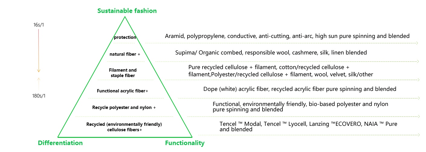 Long Run defines a new standard for high-quality YARN (SBCN YARN), a good yarn fiber source (S end) should be based on transparency and sustainability, yarn should meet the needs of visual, feeling and tactile value of (B end) fabric, but also meet the needs of (C end) brand owners with aesthetic feeling, emotion and temperature, and strong functional design value. It is also necessary to bring continuous improvement to the ecological environment (N-end).